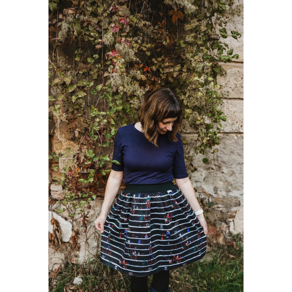 Anna je sukně s pružnou gumou v pase s jemným řasením. Má kapsy, takže do nich schováte drobnosti své i Vašich ratolestí. Sukně je šitá bez spodničky.