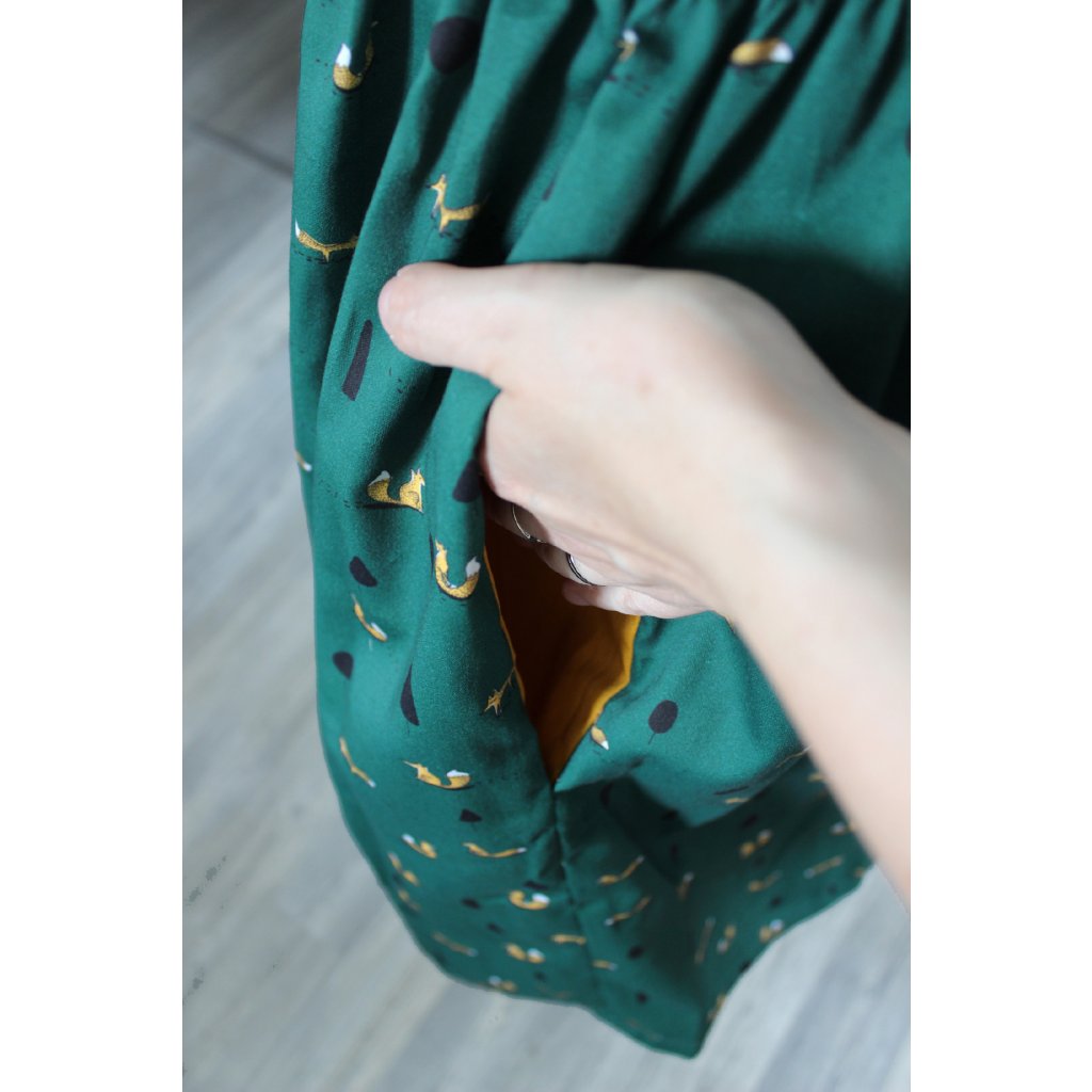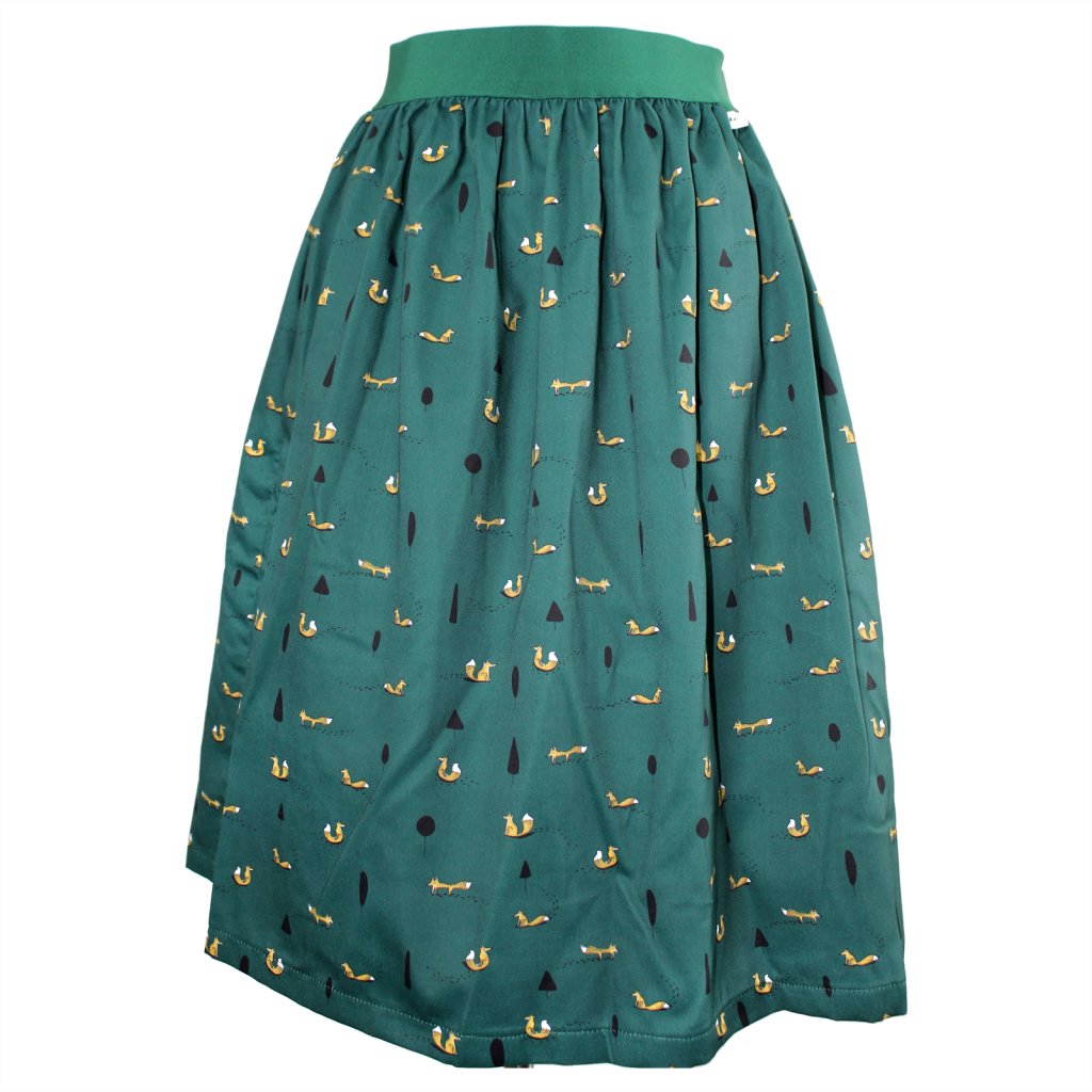 Sukně je šitá z látky s naší autorskou ilustrací Lenivá. Fotografie zelené sukně s liškami jsou pro ilustraci střihu sukně.