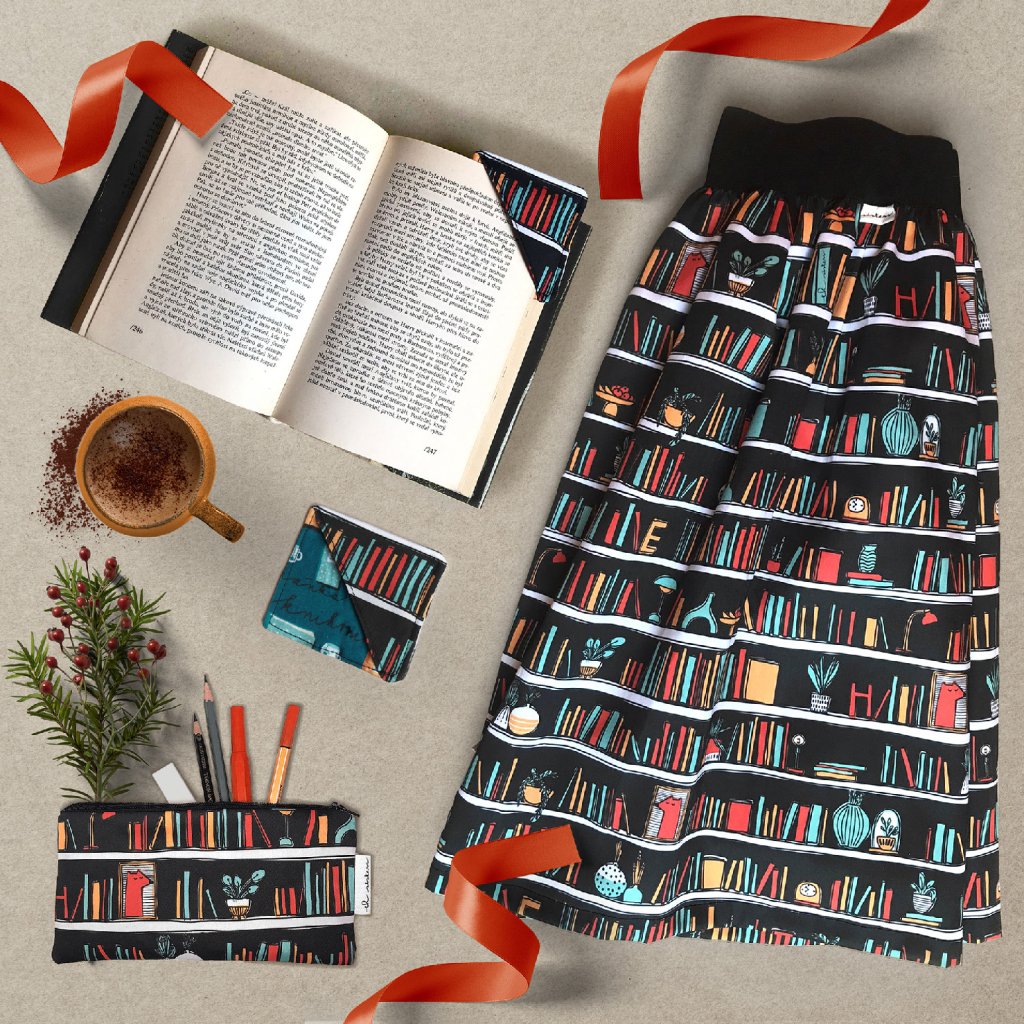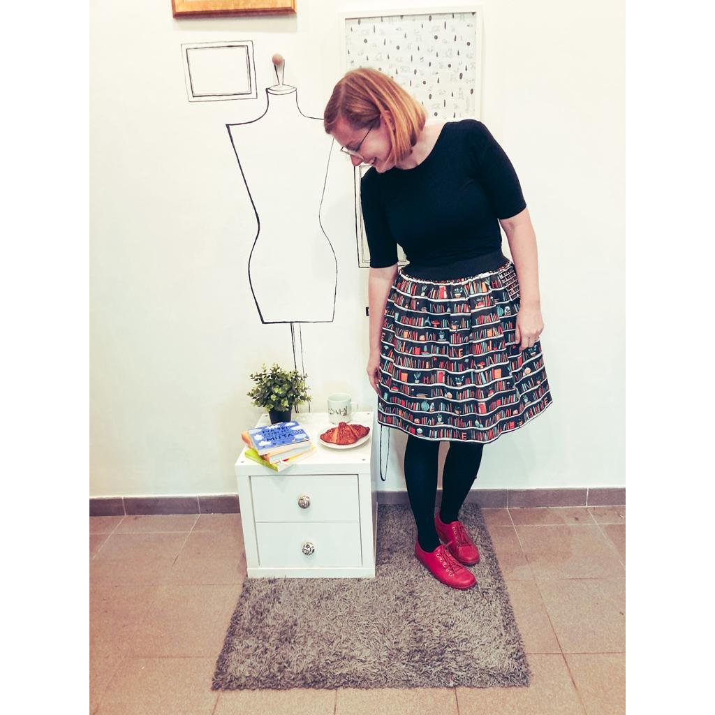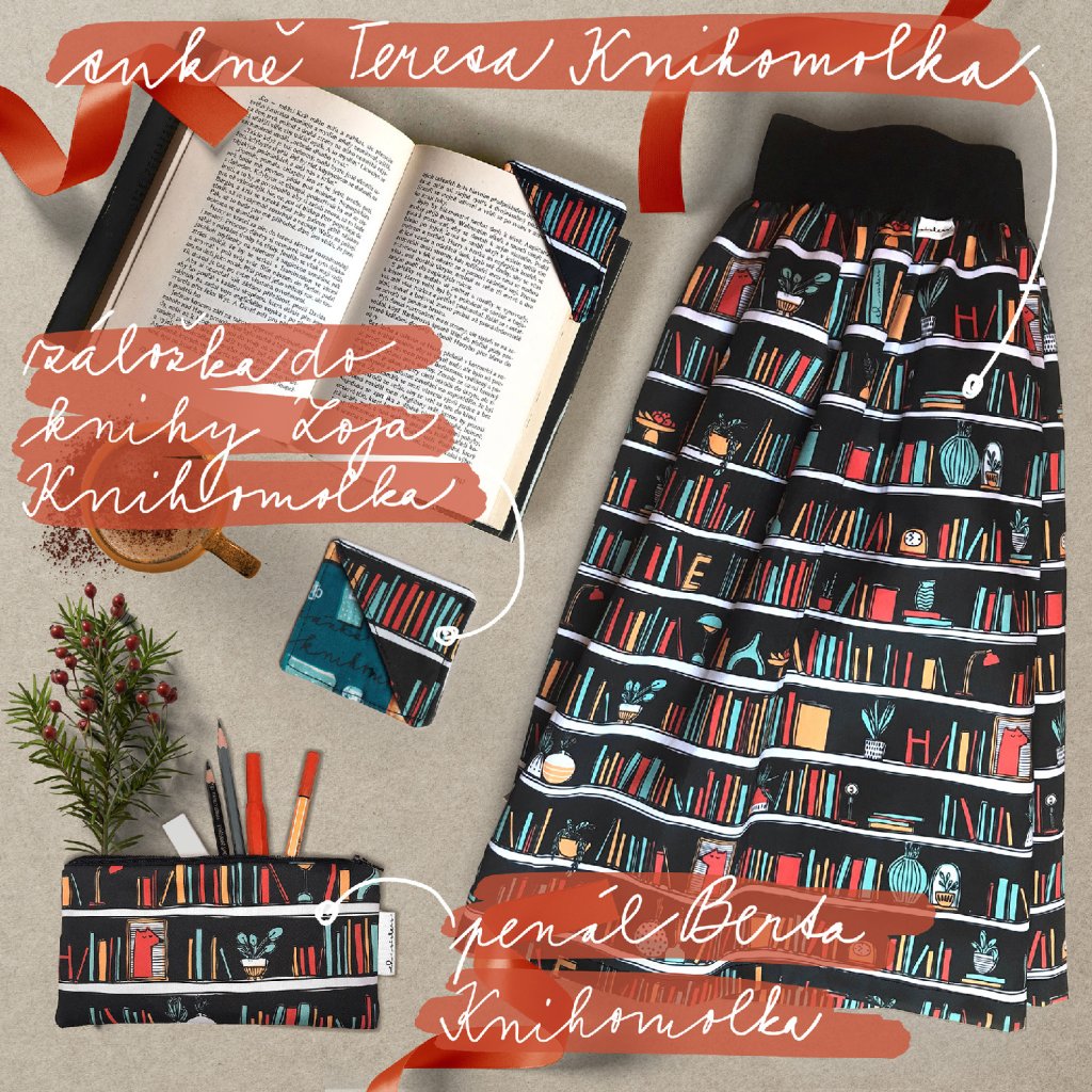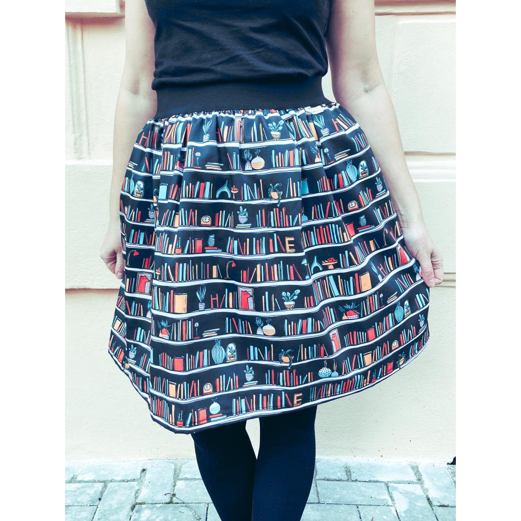 - naši nejoblíbenější sukni Teresa s autorským tiskem Knihomolka