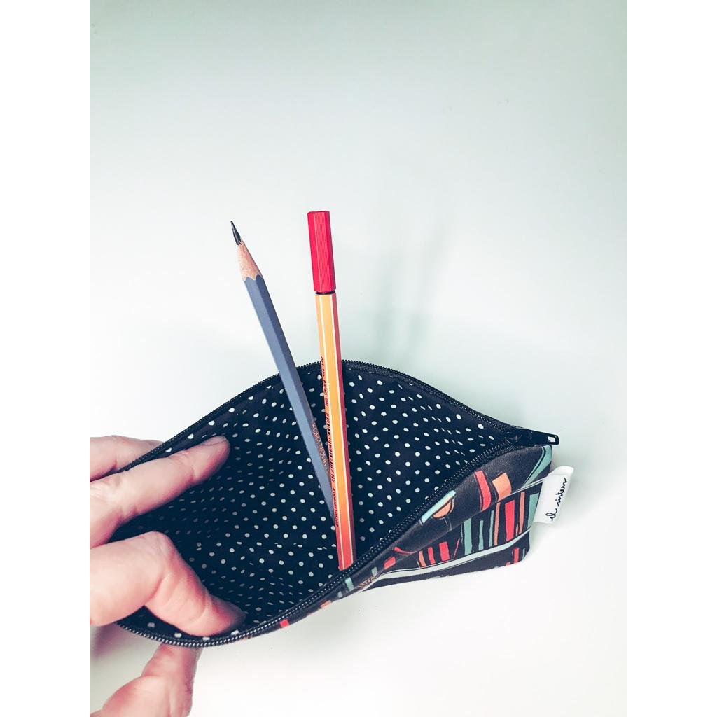 Penál Berta je šitý ze 100% bavlny, má černý zip a vnitřní látku, která ladí s vnější látkou s autorským potiskem. Vnitřní látka bude vždy puntíkatá anebo s proužkem. Rozměry jsou 20x10cm.