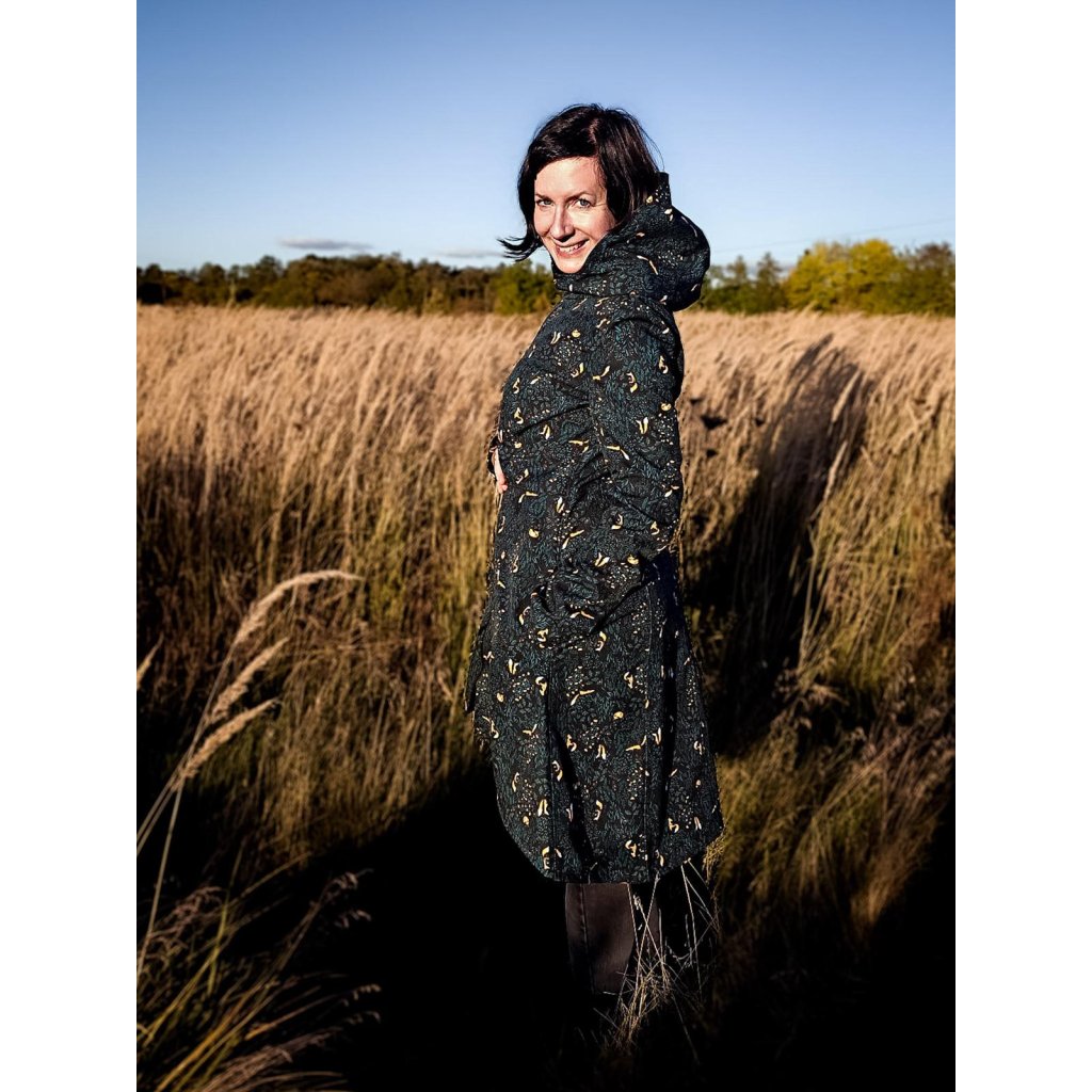 Kabátek je šitý z látky s autorským potiskem z dílny eh sisters s názvem Toulavá.