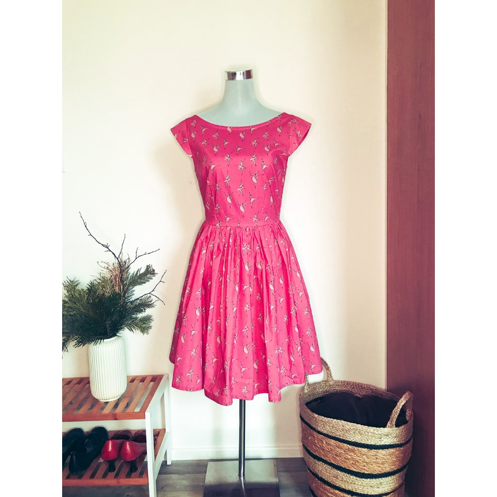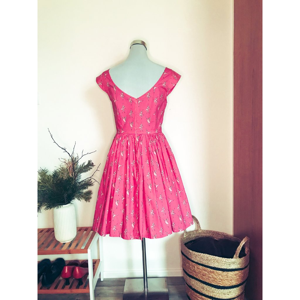 Šaty střihu inspirovaného módou 50.let s řasenou sukní, krátkými rukávky z autorské látky Baletková, o chlup světlejší, než je Baletková, na kterou jste zvyklé.