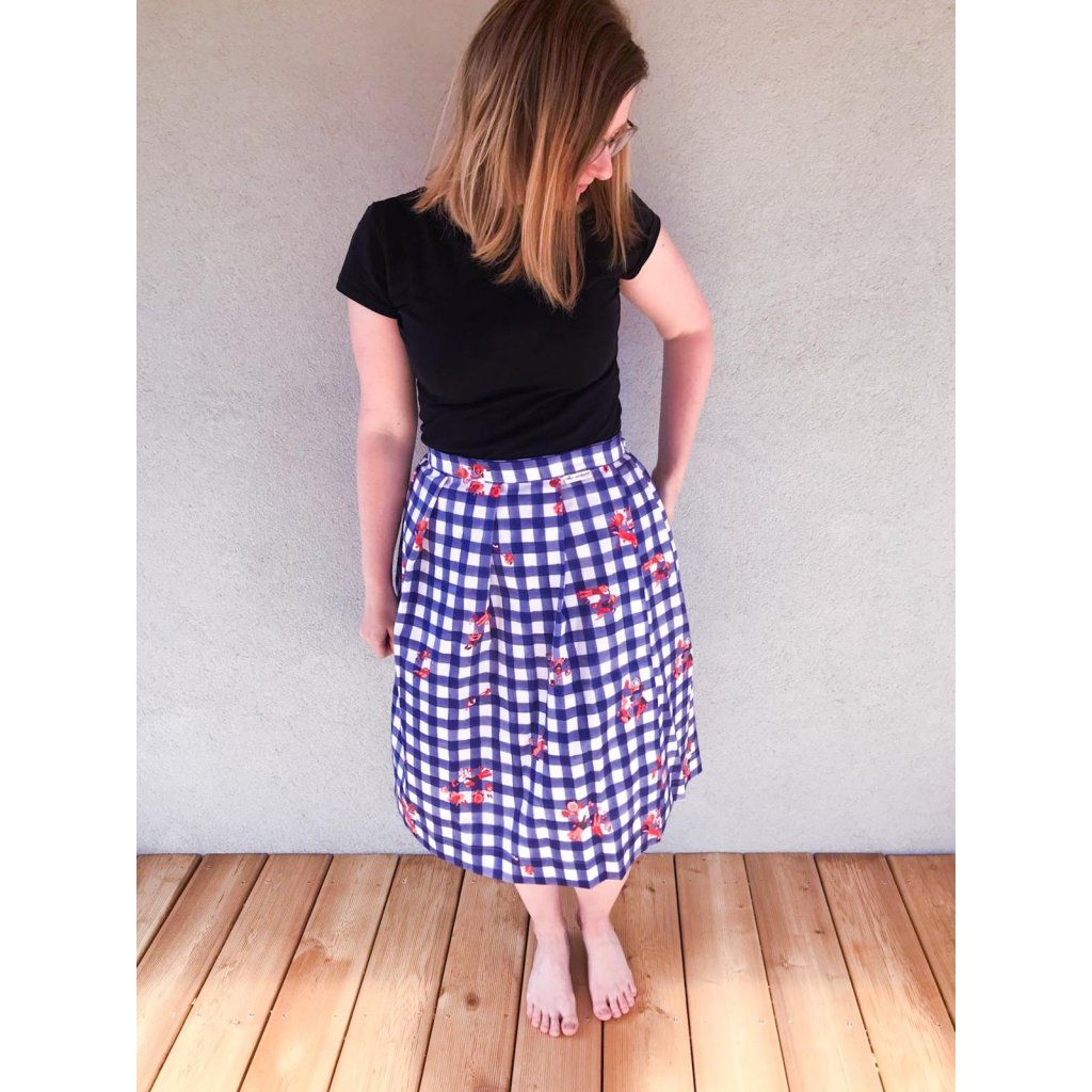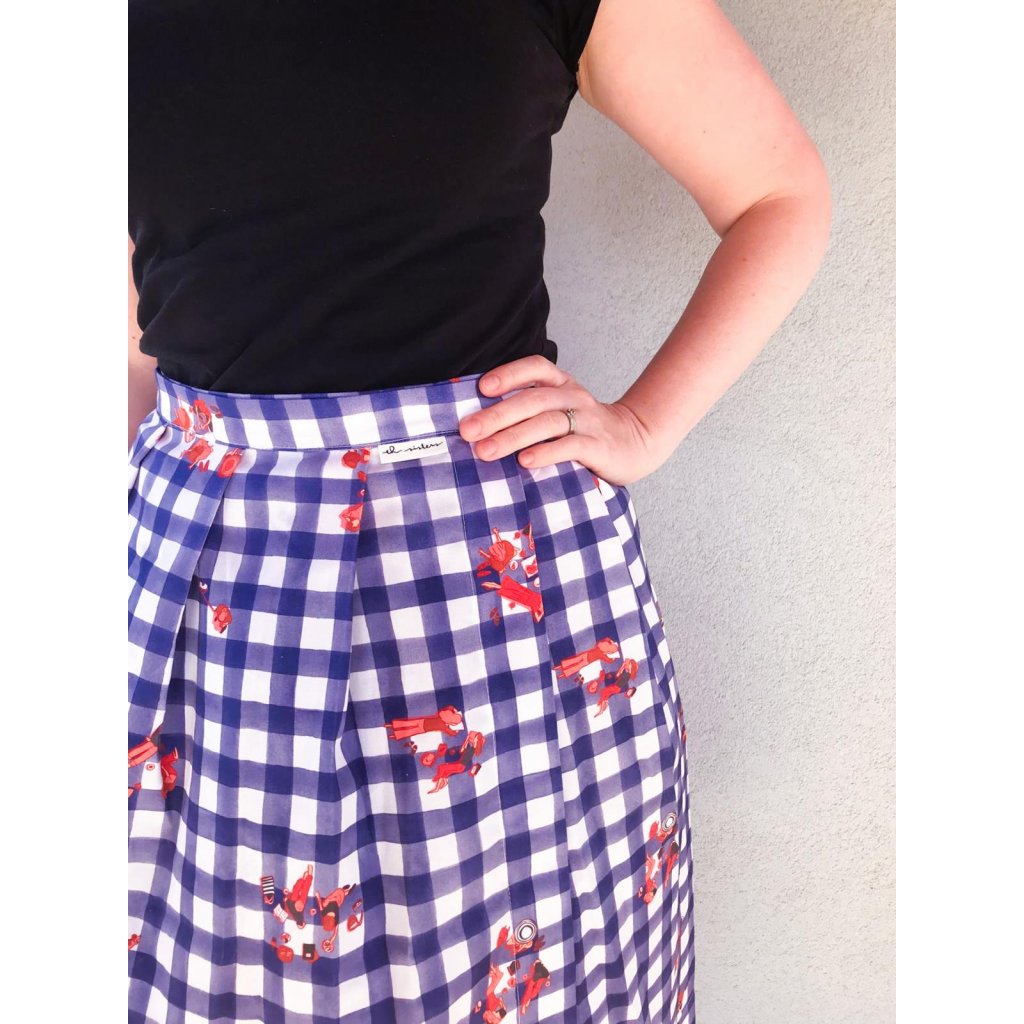 Sukně je šitá z látky s tiskem dle naší autorské ilustrace s názvem Modrá pikniková. Fotky s červenou zavinovací sukní jsou pouze ilustrační pro představu o střihu.