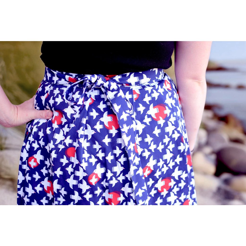 Zavinovací sukně Kim sedne každé postavě, je s pravidelnými sklady a zavazuje se na mašli.