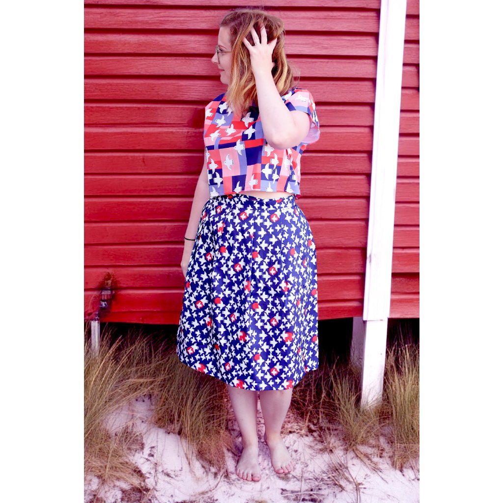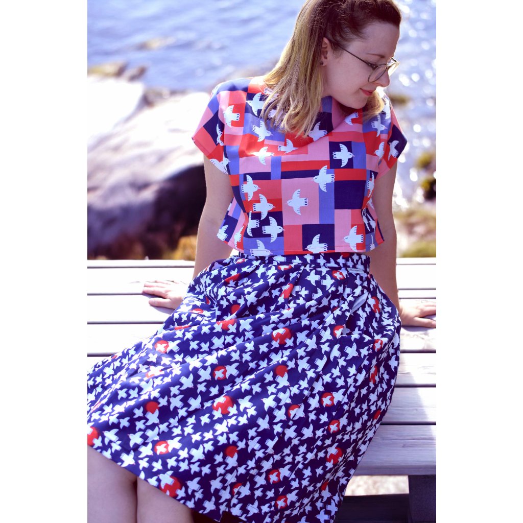 Sukně je šitá z látky s tiskem dle naší autorské ilustrace s názvem Volná.